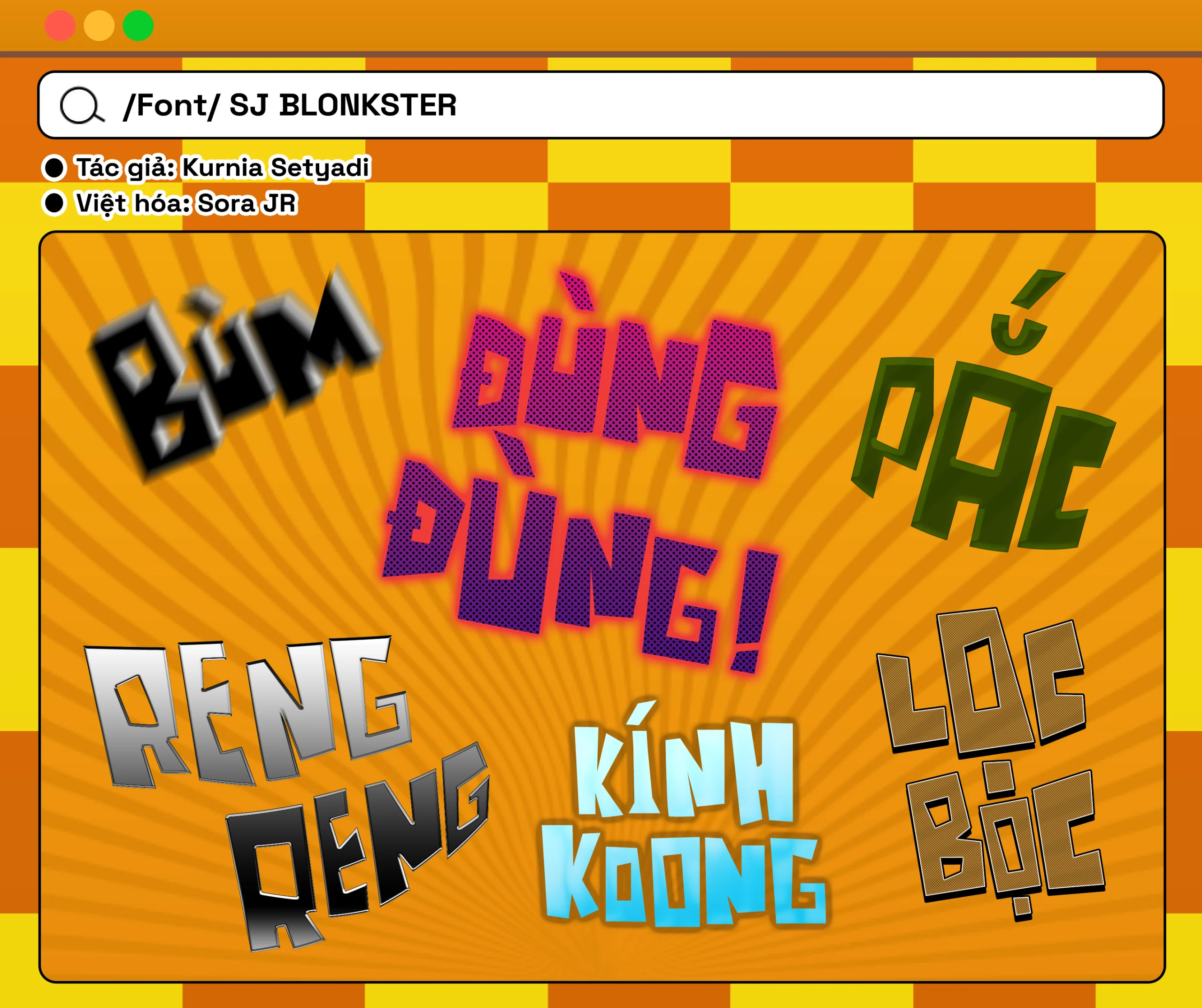 SJ Blonkster • Font Việt hóaBold, Fonts / Leave a Comment Chọn nhanh một văn bản mẫu abcdefghijklmnopqrstuvwxyz ABCDEFGHIJKLMNOPQRSTUVWXYZ 0123456789 trường ở quê sạch và đẹp lắm do bố xây kĩ TRƯỜNG Ở QUÊ SẠCH VÀ ĐẸP LẮM DO BỐ XÂY KĨ Dân ta phải biết sử ta, cho tường gốc tích nước nhà Việt Nam DÂN TA PHẢI BIẾT SỬ TA, CHO TƯỜNG GỐC TÍCH NƯỚC NHÀ VIỆT NAM the quick brown fox jumps over the lazy dog THE QUICK BROWN FOX JUMPS OVER THE LAZY DOG Bấm vào đây để gõ thử nàooo~ Kích cỡ Khoảng cách dòng Khoảng cách giữa các ký tự Xem bảng ký tự đầy đủ Truy cập Truy cập