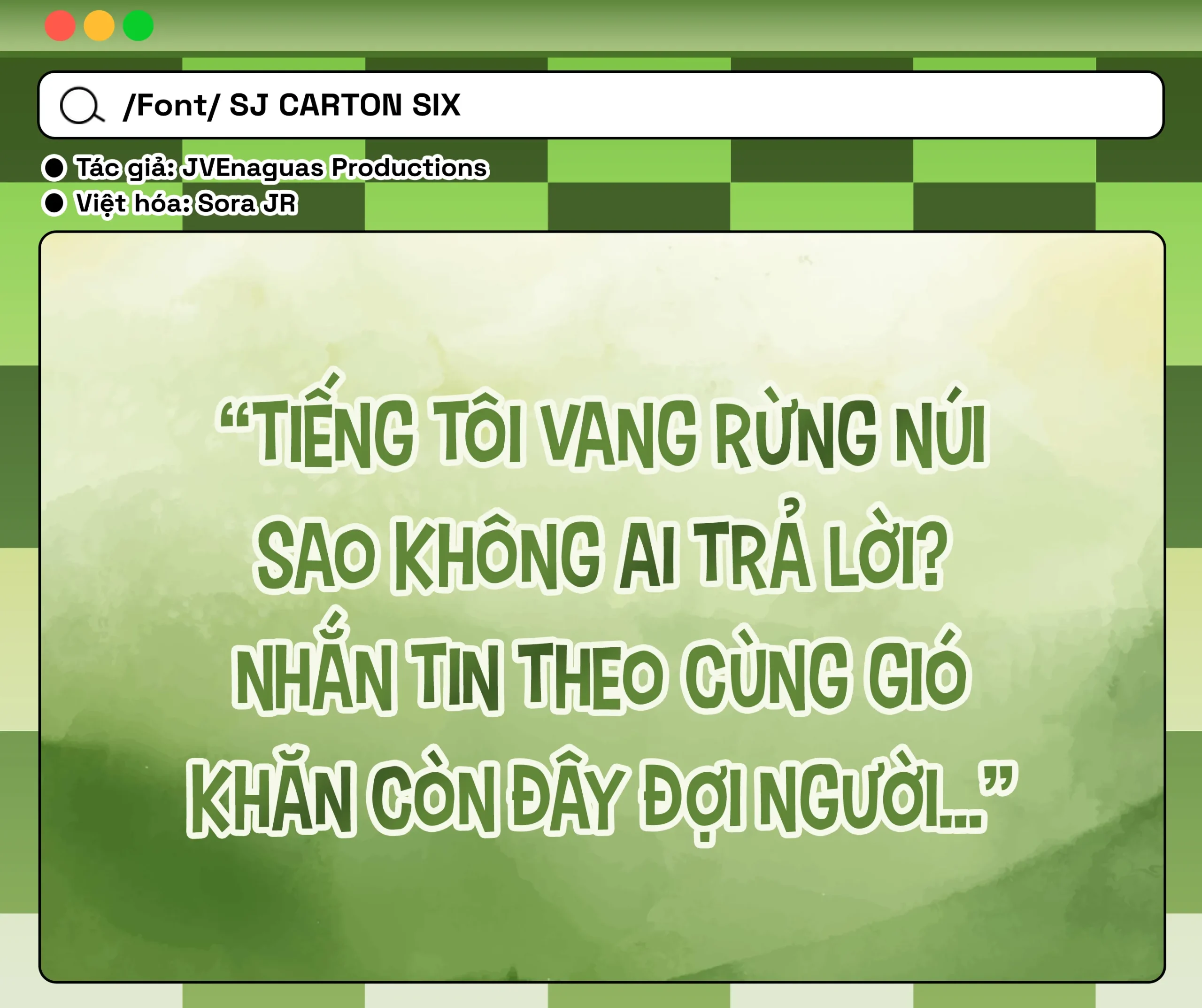SJ Carton Six • Font Việt hóaBold, Fonts, Free / Leave a Comment Chọn nhanh một văn bản mẫu abcdefghijklmnopqrstuvwxyz ABCDEFGHIJKLMNOPQRSTUVWXYZ 0123456789 trường ở quê sạch và đẹp lắm do bố xây kĩ TRƯỜNG Ở QUÊ SẠCH VÀ ĐẸP LẮM DO BỐ XÂY KĨ Dân ta phải biết sử ta, cho tường gốc tích nước nhà Việt Nam DÂN TA PHẢI BIẾT SỬ TA, CHO TƯỜNG GỐC TÍCH NƯỚC NHÀ VIỆT NAM the quick brown fox jumps over the lazy dog THE QUICK BROWN FOX JUMPS OVER THE LAZY DOG Bấm vào đây để gõ thử nàooo~ Kích cỡ Khoảng cách dòng Khoảng cách giữa các ký tự Xem bảng ký tự đầy đủ Truy cập Truy cập