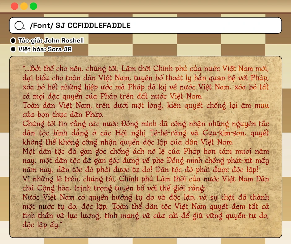 SJ CCFiddlefaddle • Font Việt hóaFonts, Medium / Leave a Comment Chọn nhanh một văn bản mẫu abcdefghijklmnopqrstuvwxyz ABCDEFGHIJKLMNOPQRSTUVWXYZ 0123456789 trường ở quê sạch và đẹp lắm do bố xây kĩ TRƯỜNG Ở QUÊ SẠCH VÀ ĐẸP LẮM DO BỐ XÂY KĨ Dân ta phải biết sử ta, cho tường gốc tích nước nhà Việt Nam DÂN TA PHẢI BIẾT SỬ TA, CHO TƯỜNG GỐC TÍCH NƯỚC NHÀ VIỆT NAM the quick brown fox jumps over the lazy dog THE QUICK BROWN FOX JUMPS OVER THE LAZY DOG Bấm vào đây để gõ thử nàooo~ Kích cỡ Khoảng cách dòng Khoảng cách giữa các ký tự Xem bảng ký tự đầy đủ Truy cập Truy cập