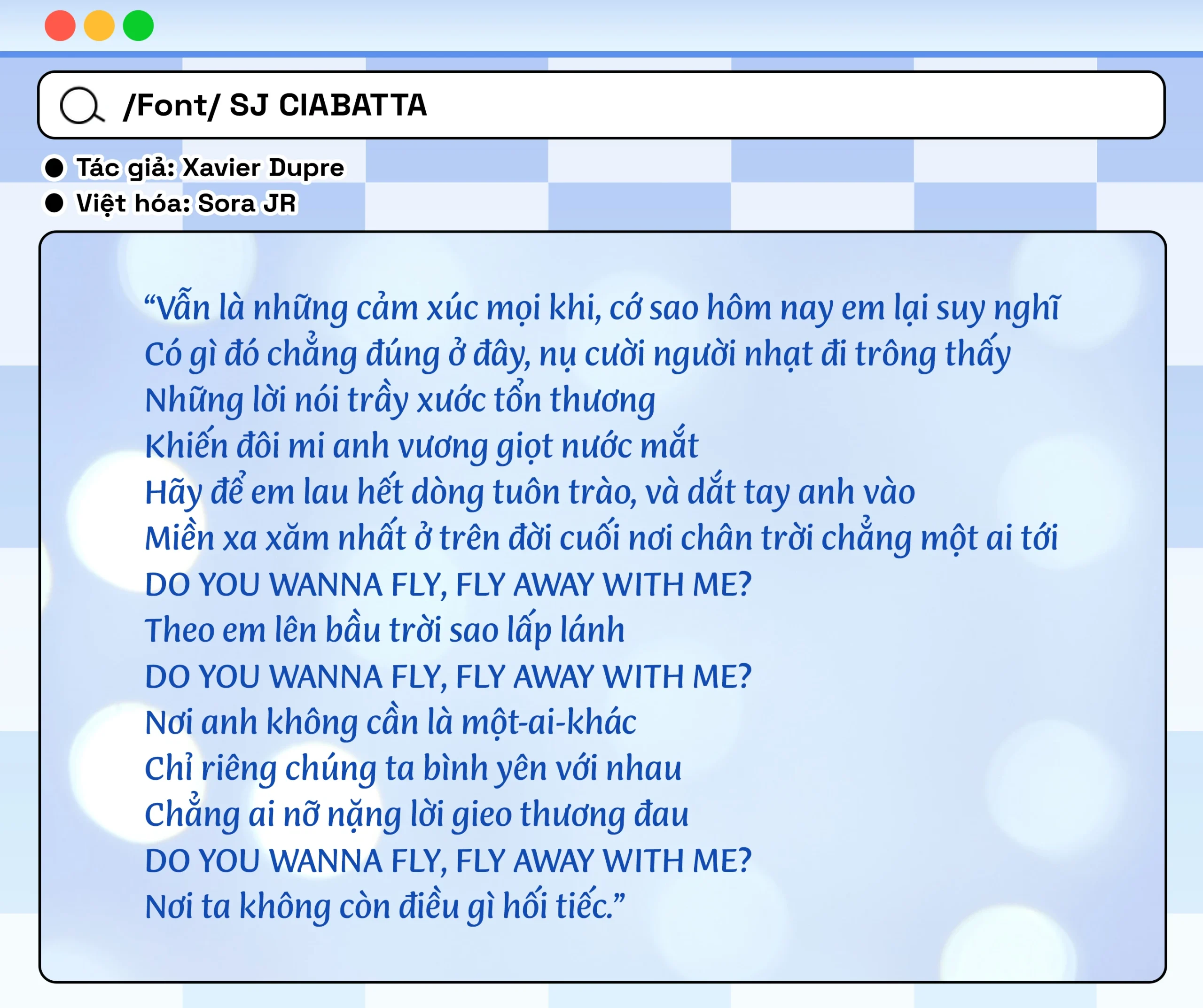 SJ Ciabatta • Font Việt hóaFonts, Light / Leave a Comment Chọn nhanh một văn bản mẫu abcdefghijklmnopqrstuvwxyz ABCDEFGHIJKLMNOPQRSTUVWXYZ 0123456789 trường ở quê sạch và đẹp lắm do bố xây kĩ TRƯỜNG Ở QUÊ SẠCH VÀ ĐẸP LẮM DO BỐ XÂY KĨ Dân ta phải biết sử ta, cho tường gốc tích nước nhà Việt Nam DÂN TA PHẢI BIẾT SỬ TA, CHO TƯỜNG GỐC TÍCH NƯỚC NHÀ VIỆT NAM the quick brown fox jumps over the lazy dog THE QUICK BROWN FOX JUMPS OVER THE LAZY DOG Bấm vào đây để gõ thử nàooo~ Kích cỡ Khoảng cách dòng Khoảng cách giữa các ký tự Xem bảng ký tự đầy đủ Truy cập Truy cập