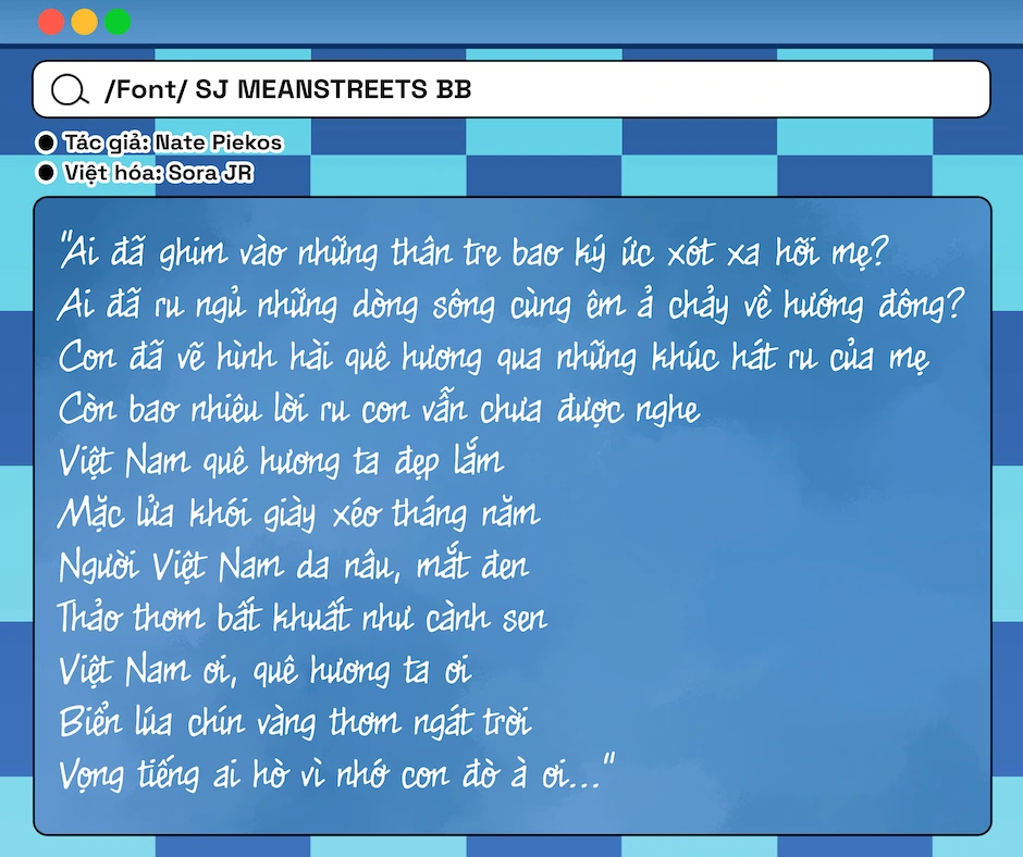 SJ MeanStreetsBB • Font Việt hóaFonts, Light / 4 Comments Chọn nhanh một văn bản mẫu abcdefghijklmnopqrstuvwxyz ABCDEFGHIJKLMNOPQRSTUVWXYZ 0123456789 trường ở quê sạch và đẹp lắm do bố xây kĩ TRƯỜNG Ở QUÊ SẠCH VÀ ĐẸP LẮM DO BỐ XÂY KĨ Dân ta phải biết sử ta, cho tường gốc tích nước nhà Việt Nam DÂN TA PHẢI BIẾT SỬ TA, CHO TƯỜNG GỐC TÍCH NƯỚC NHÀ VIỆT NAM the quick brown fox jumps over the lazy dog THE QUICK BROWN FOX JUMPS OVER THE LAZY DOG Bấm vào đây để gõ thử nàooo~ Kích cỡ Khoảng cách dòng Khoảng cách giữa các ký tự Xem bảng ký tự đầy đủ Truy cập Truy cập
