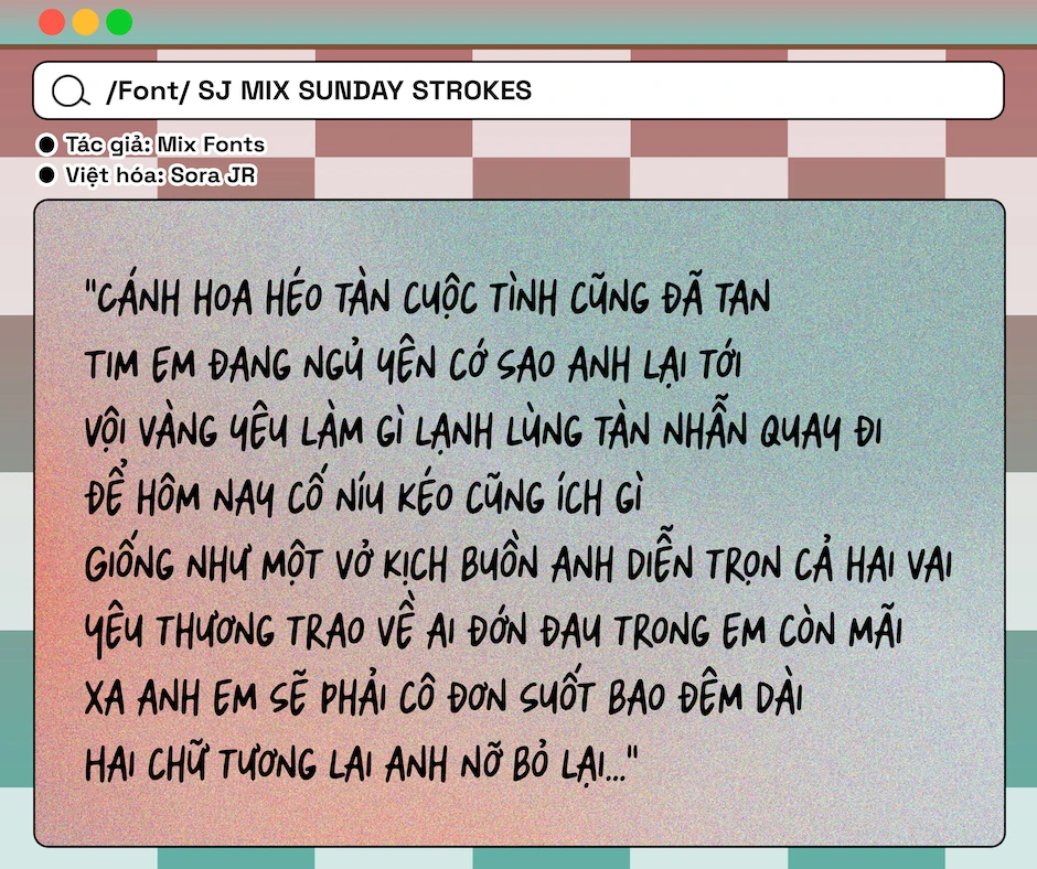 SJ Mix Sunday Strokes • Font Việt hóaFonts, Medium / Leave a Comment Chọn nhanh một văn bản mẫu abcdefghijklmnopqrstuvwxyz ABCDEFGHIJKLMNOPQRSTUVWXYZ 0123456789 trường ở quê sạch và đẹp lắm do bố xây kĩ TRƯỜNG Ở QUÊ SẠCH VÀ ĐẸP LẮM DO BỐ XÂY KĨ Dân ta phải biết sử ta, cho tường gốc tích nước nhà Việt Nam DÂN TA PHẢI BIẾT SỬ TA, CHO TƯỜNG GỐC TÍCH NƯỚC NHÀ VIỆT NAM the quick brown fox jumps over the lazy dog THE QUICK BROWN FOX JUMPS OVER THE LAZY DOG Bấm vào đây để gõ thử nàooo~ Kích cỡ Khoảng cách dòng Khoảng cách giữa các ký tự Xem bảng ký tự đầy đủ Truy cập Truy cập